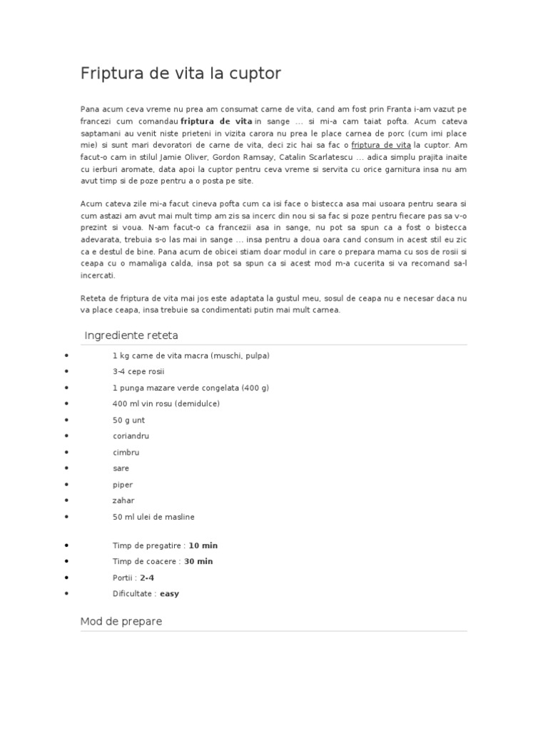Friptura De Vita La Cuptor Scarlatescu